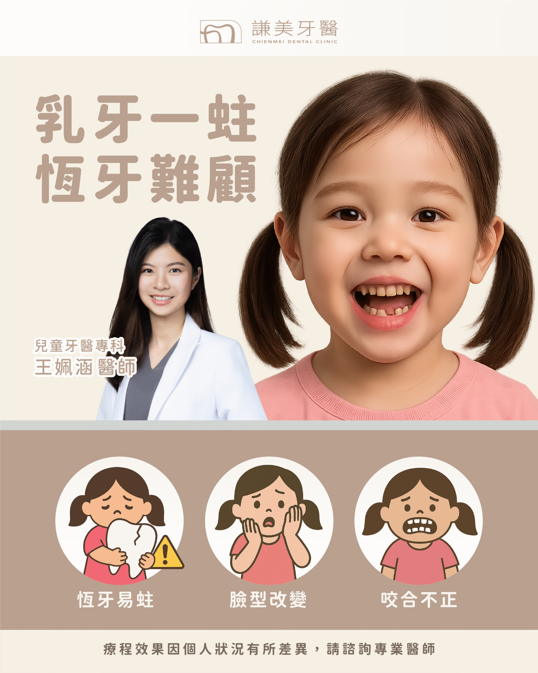 許多爸媽以為: 「乳牙蛀掉沒關係,反正會換」 但你知道嗎? 蛀牙拖著不補,會害恆牙長歪 乳牙掉太早,咬合容易亂 不趕快治療,小洞變大傷 孩子的牙齒健康, 從第一顆乳牙就該被好好對待! 謙美診所特別邀請 台大兒童牙科專科 #王姵涵醫師...